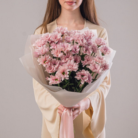 Хризантема кустовая розовая - 3 шт., Современная упаковка - 1 шт., Лента атласная - 1 шт.Доставка 0₽ от 30-ти минут
